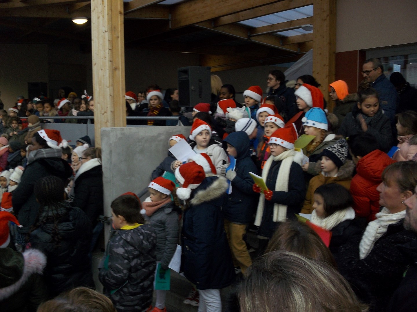 Malgré le froid, les élèves se sont installés sur les gradins afin de chanter des chants traditionnels de Noël devant leur famille ou leur nounou.