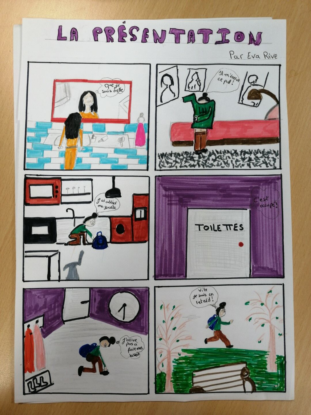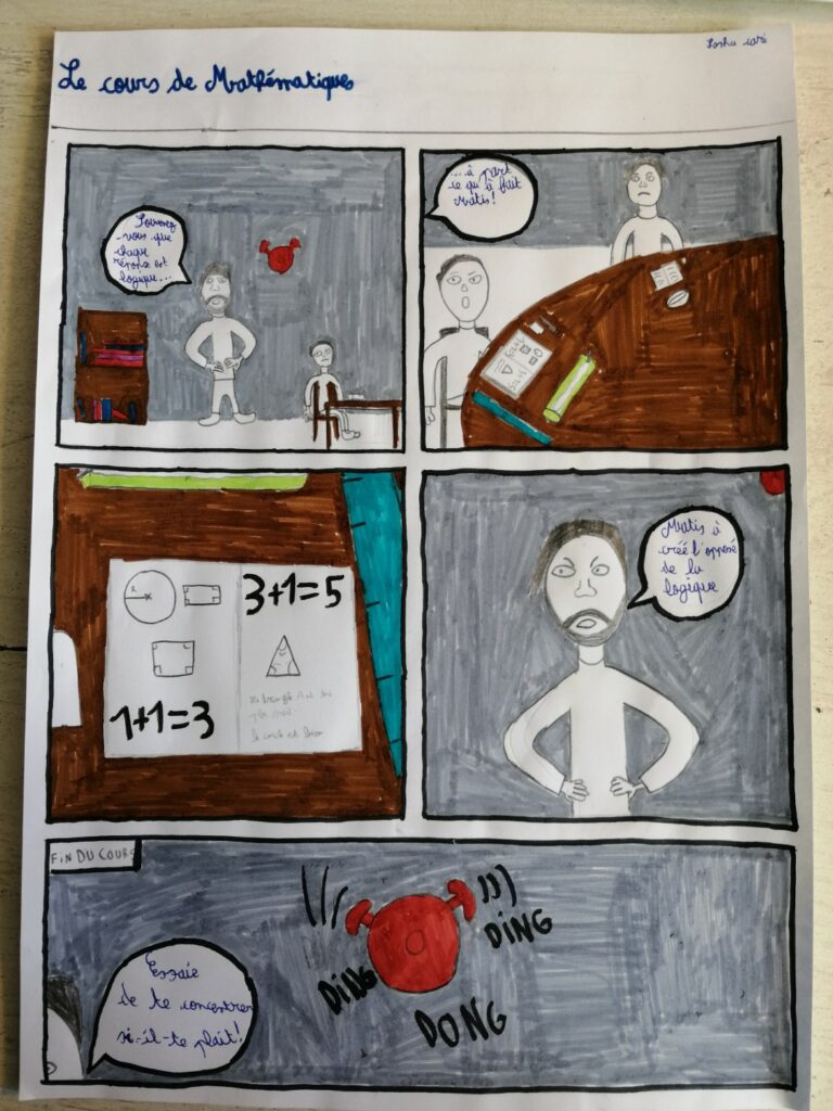 Voici le travail bande dessinée réalisé par les 4eme. Ils devaient, en une planche et en utilisant les codes de la bande dessinée, raconter un moment de la journée d’un collégien.